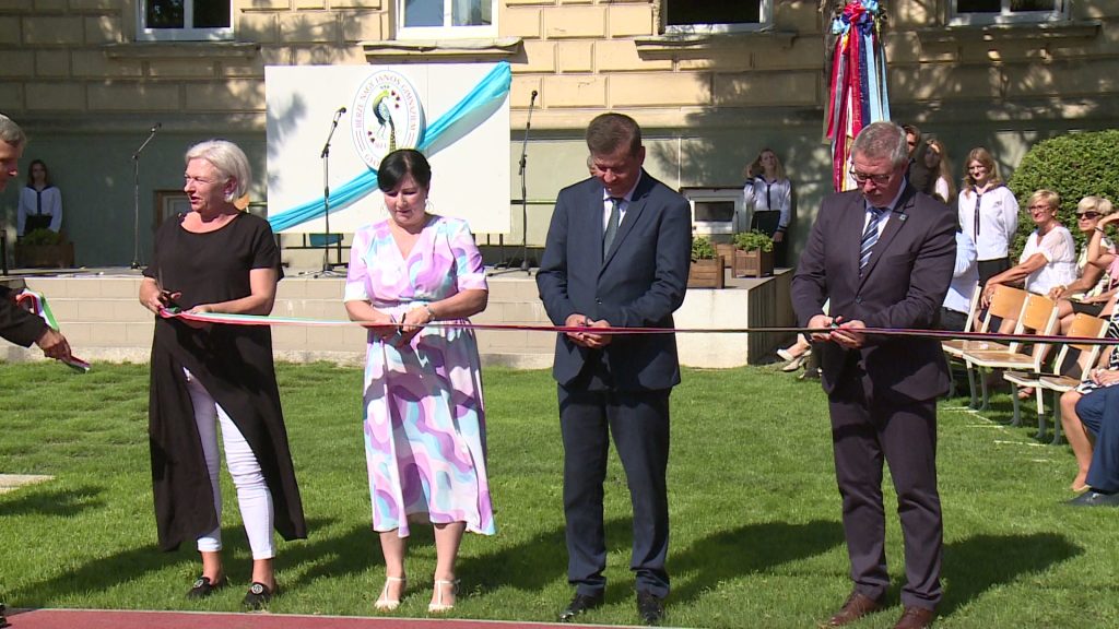 A gimnázium első embere, Szókovács Péter, polgármester, valamint Sipos Imre köznevelésért felelős helyettes államtitkár közösen vágták át a szalagot, mostantól tehát hivatalosan is birtokba veheti a csaknem 700 tanuló az új burkolattal ellátott szabadtéri részt.